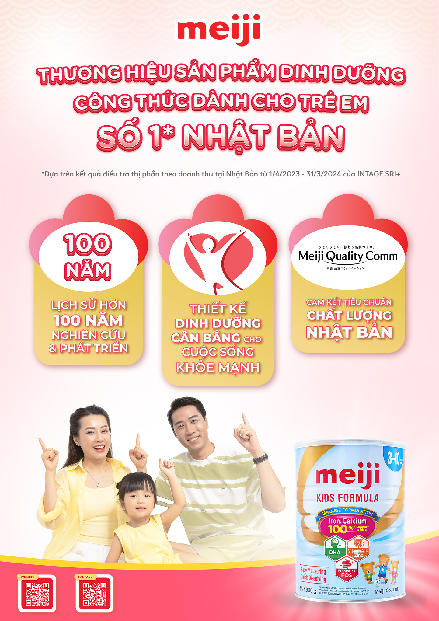 Trong 100 năm qua, Meiji đã dành hơn 45 năm nghiên cứu về sữa mẹ và sự phát triển của trẻ. Dựa trên những kết quả nghiên cứu đó, Meiji liên tục cải tiến và cho ra mắt sản phẩm mới phù hợp với từng lứa tuổi cũng như các sản phẩm dạng viên tiện lợi cho việc chăm sóc trẻ. Đó cũng là lí do Meiji là thương hiệu sản phẩm dinh dưỡng công thức có thị phần số 1 Nhật Bản(*).